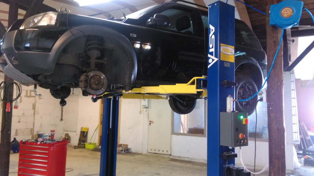 SAE40 – Podnośnik dwukolumnowy z ramą jest jednym z najlepiej sprzedających się podnośników dwukolumnowych automatycznych. Zdjęcie z miejscowości Bierdzany niedaleko Opola.